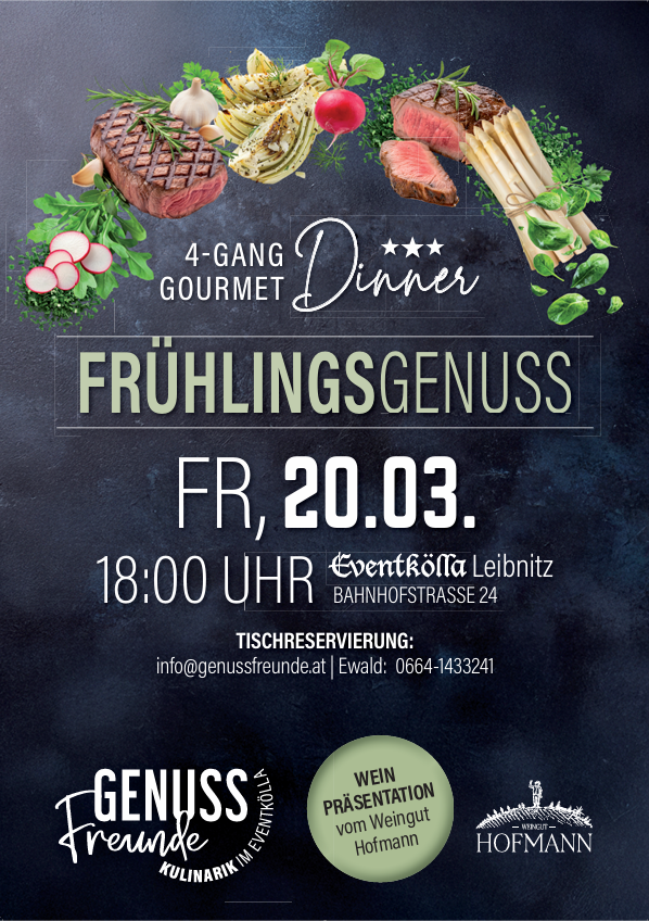 Nur ein Klick: https://www.xn--eventklla-57a.at/event/fruehlingsgenuss-gourmet-dinner-mit-weingut-hofmann/